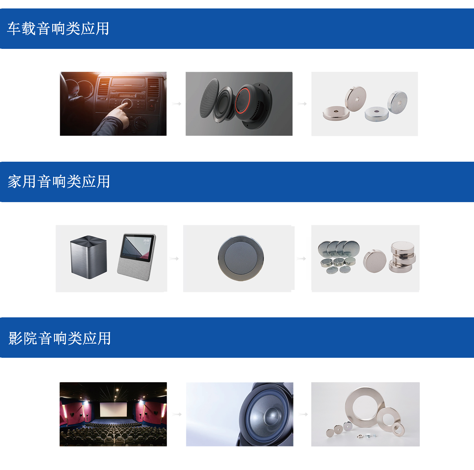 烧结钕铁硼作为扬声器的磁性材料,其优势立刻显示出来:体积小、重量轻、灵敏度高、失真小。应用稀土钕铁硼磁性材料替代传统铁氧体磁芯或铝镍钴磁场不但可以提升音箱的敏感度,而且还能大大减少常用磁场的总数